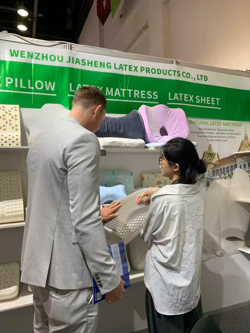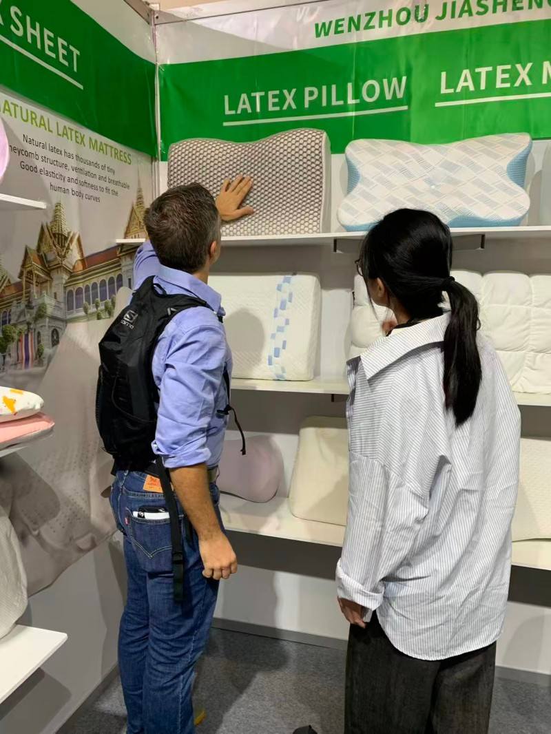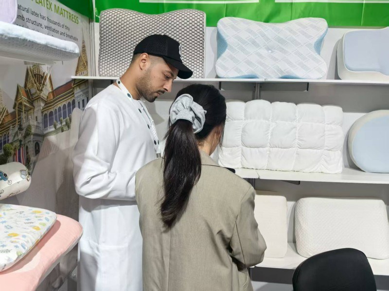 या दुबई स्लीप एक्झिबिशनमध्ये, जगभरातील अभ्यागतांना आमची झोप-केंद्रित उशा दाखवण्याचा आम्हाला सन्मान आहे. आम्ही बाजारात सर्वाधिक विकल्या जाणाऱ्या दोन उशा सादर करण्यासाठी समर्पित आहोत: दनैसर्गिक लेटेक्स उशीआणि आधुनिक स्मार्ट साहित्यमेमरी फोम उशी. लेटेक्सचे क्विक रिबाउंड आणि अँटी-एलर्जी गुणधर्म लेटेक्स उत्साही लोकांच्या पसंतीस उतरतात. दरम्यान, मेमरी फोमचा अंतिम फिट गाढ झोप देऊ शकतो. साइटवरील ग्राहकांशी आमच्या सखोल संवादामुळे आम्हाला त्यांच्या उशांचा शोध घेण्याचा अनुभव आला. आमचा ठाम विश्वास आहे की झोपेच्या वेगवेगळ्या सवयींसाठी वैयक्तिकृत पर्याय प्रदान करणे ही गुणवत्तापूर्ण झोपेची गुरुकिल्ली आहे.